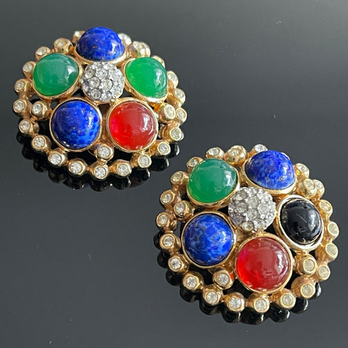 Les Bernard, belles boucles clips vintage couture avec cabochons de verre de couleur