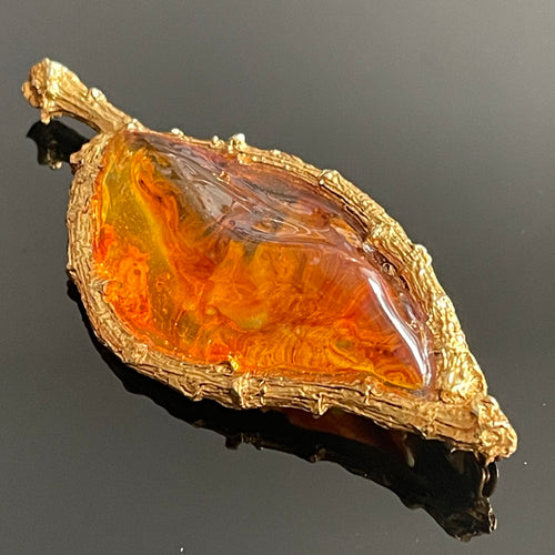 L’or du soir, rare et grande broche vintage couture en métal doré et résine couleur ambre