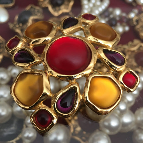 MONET, très belle broche en métal doré et cabochons de résine de couleur