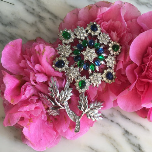 NINA RICCI, spectaculaire broche vintage couture motif fleur cabochons verts et bleus