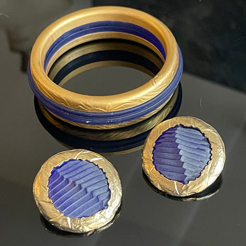 Parure vintage boucles d’oreilles + bracelet Montana en metal doré résine bleue