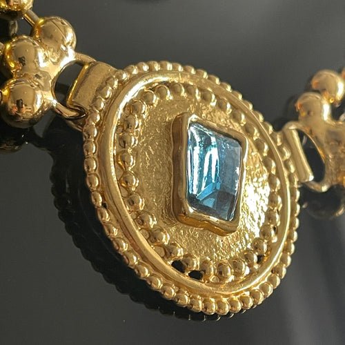 Scherrer Paris, très beau collier vintage couture en métal doré et résine bleue