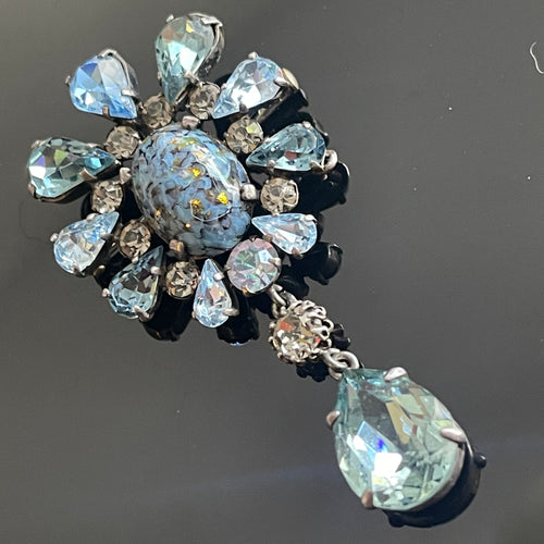 Sublime grande broche ancienne pâte de verre et cristal en camaïeu de bleus attribuée à Cis