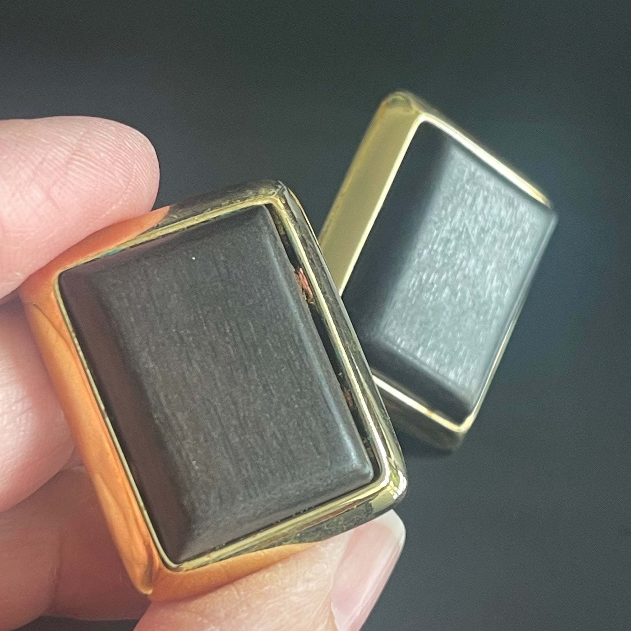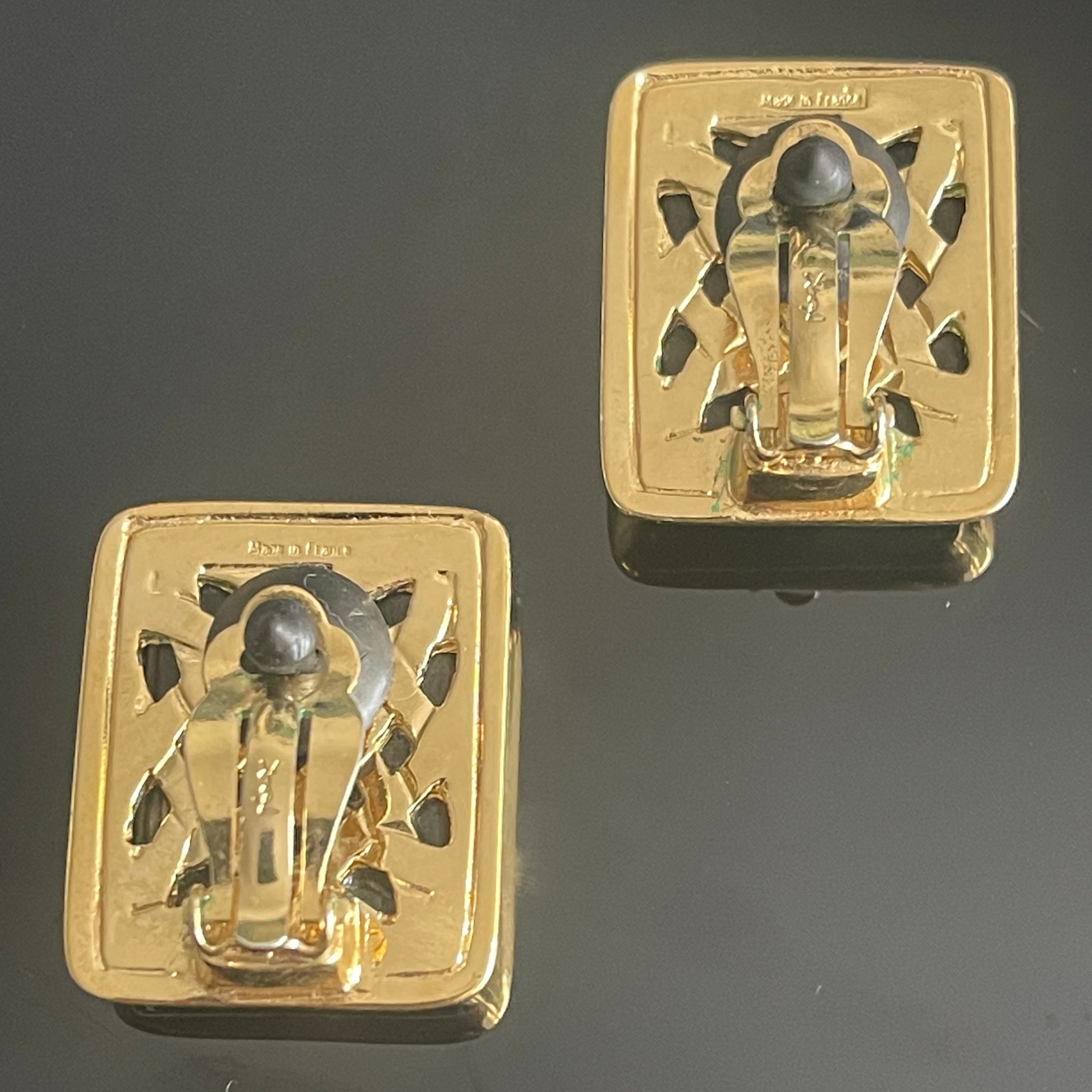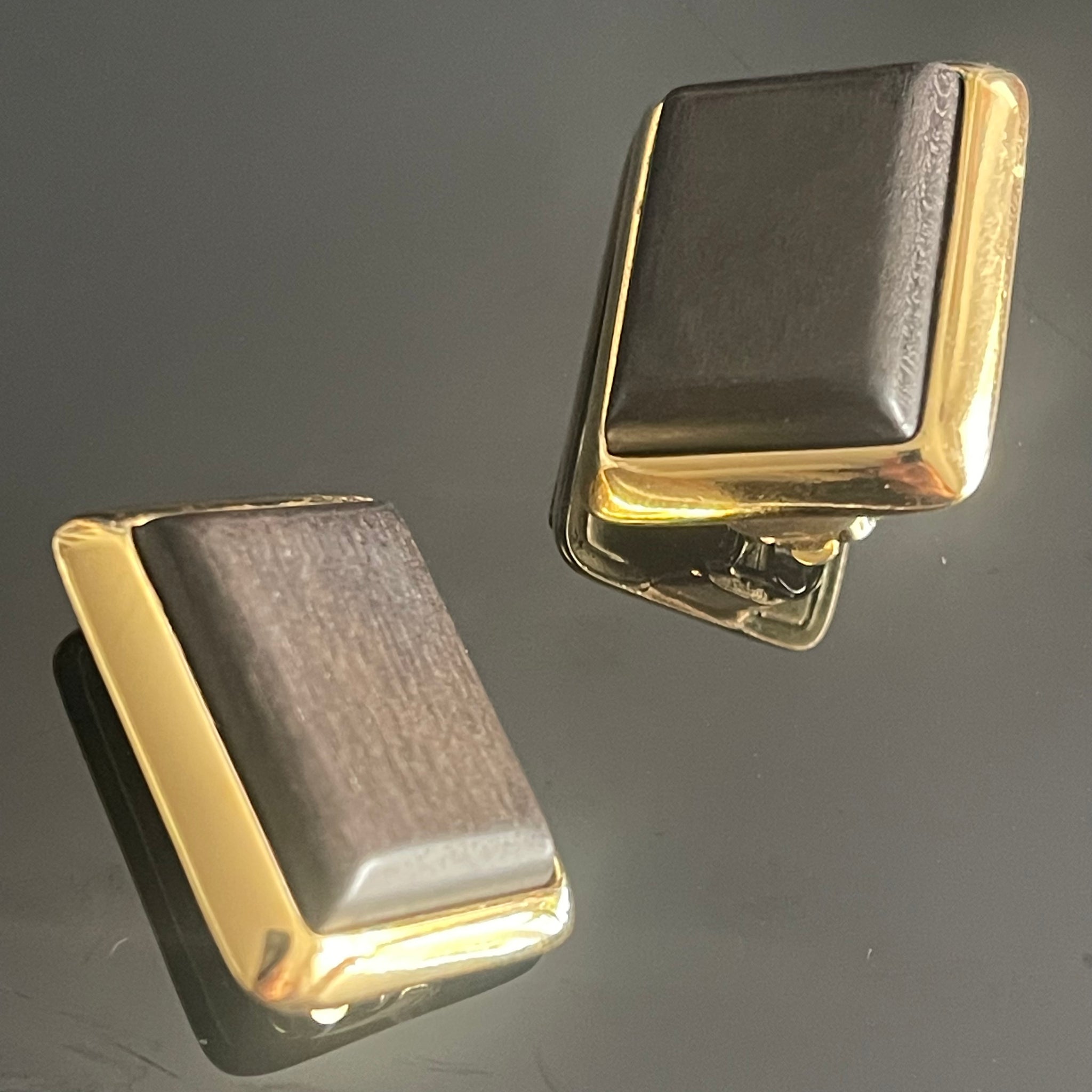 Jolies boucles anciennes signées YSL en métal doré et bois précieux (ébène) de forme rectangulaire. Très bon état d’usage, caoutchoucs de protection d’origine à l’arrière du clip, voir photos.