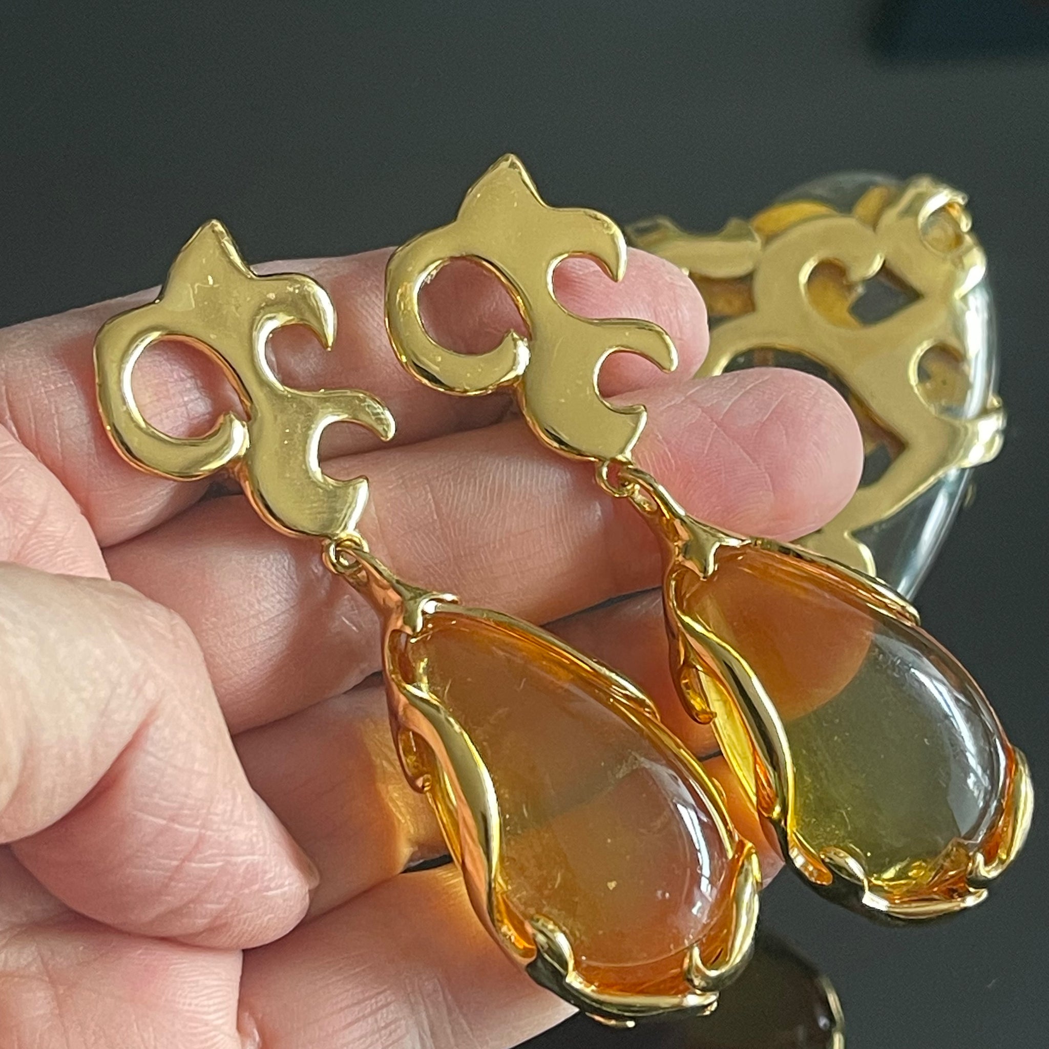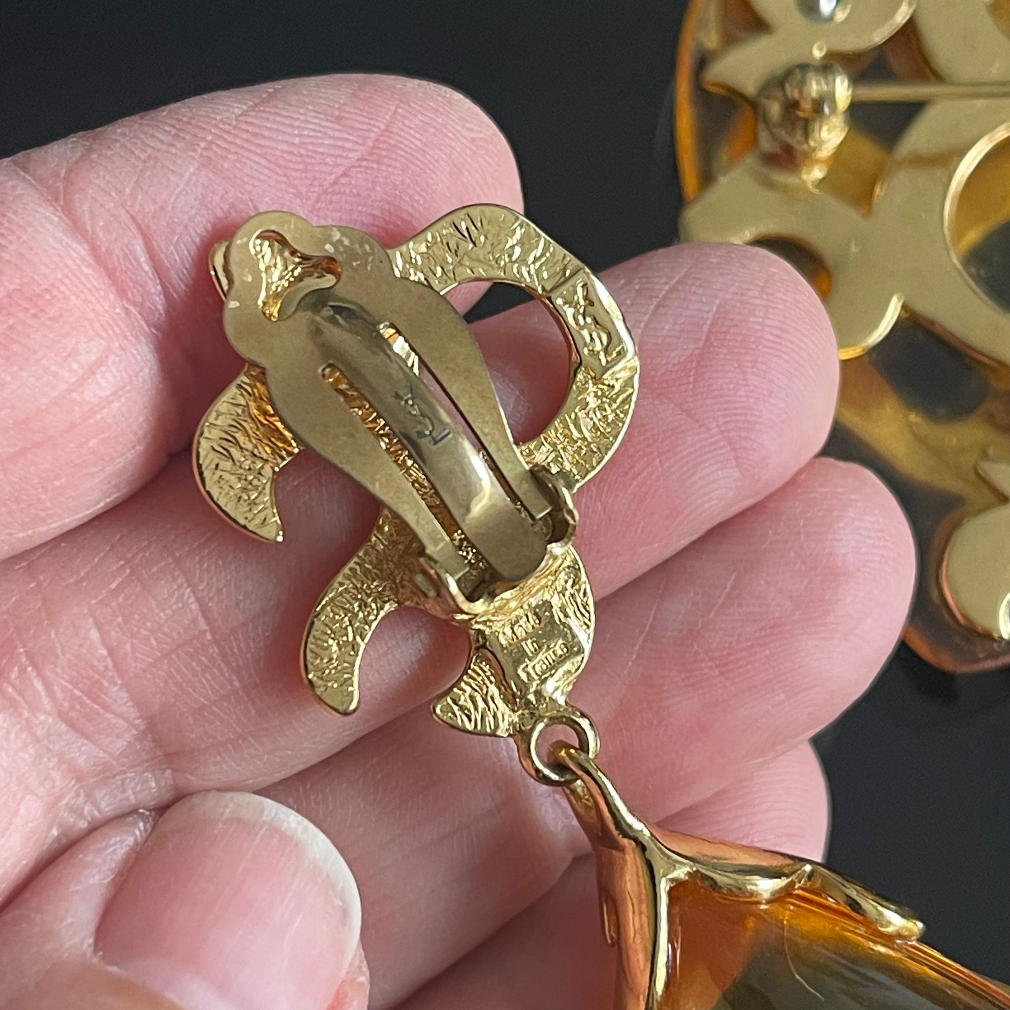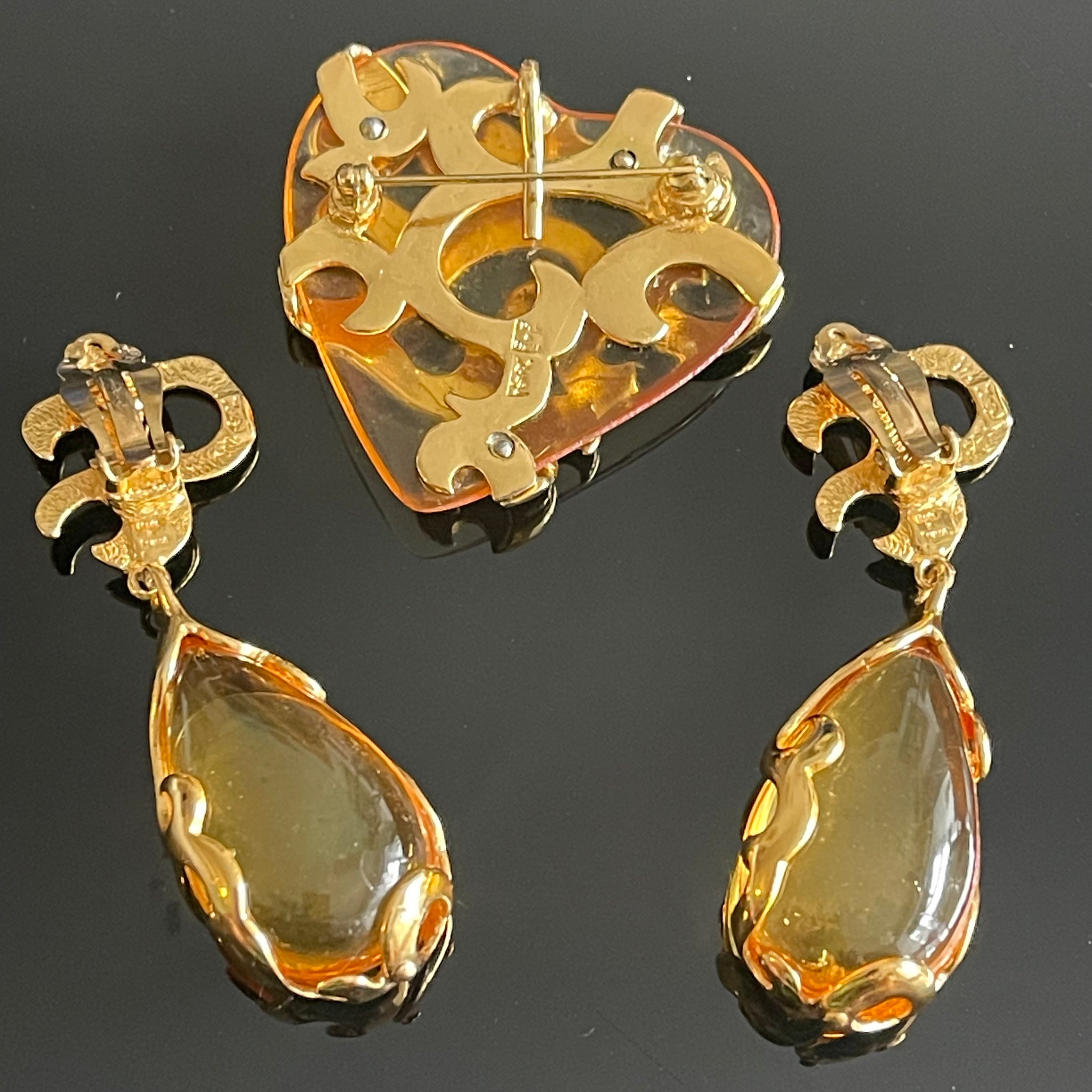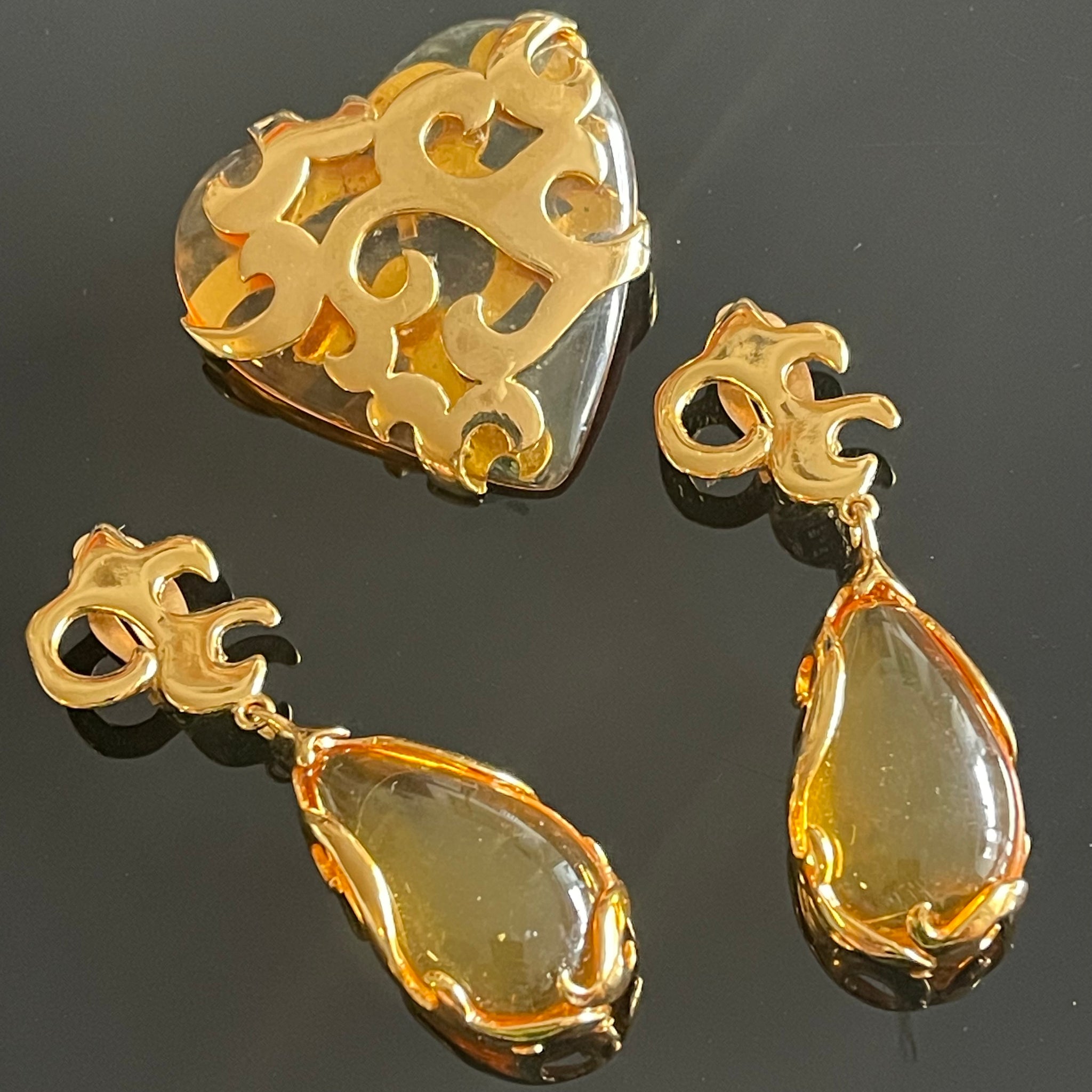 Très jolie parure vintage signée YSL en métal doré et résine jaune d’or, années 90. Le set comprend une longue paire de boucles d’oreilles clips pendantes et une grosse broche cœur pouvant également être portée en pendentif. Très bon état d’usage, voir photos.