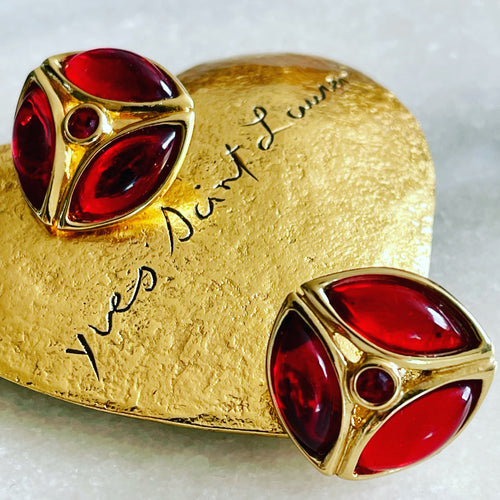 YSL, ravissantes petites boucles clips vintage en métal doré et résine rouge