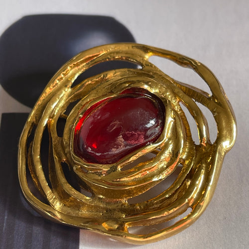 YSL, très belle broche tourbillon en métal doré et cabochon de résine rouge
