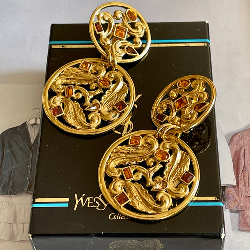 Yves Saint Laurent, grandes boucles clips pendantes en métal doré ajouré et pierres de couleur
