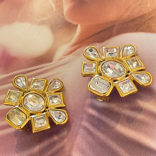 YSL par GOOSSENS, belles boucles vintage couture en métal doré et pierres blanches