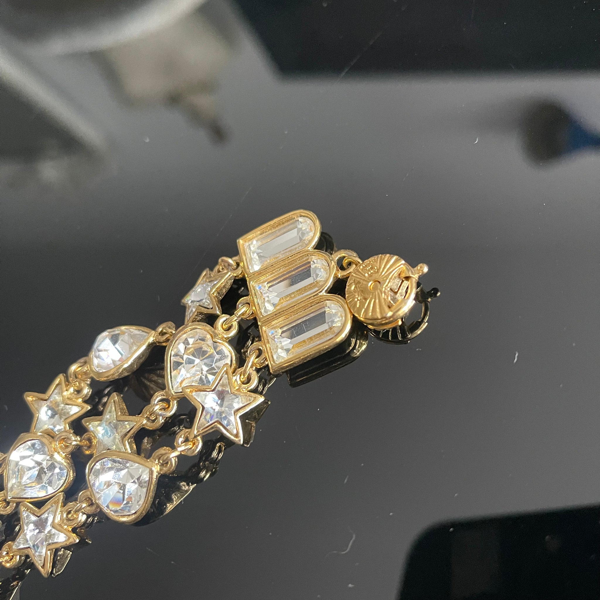Belle et rare parure vintage couture YSL par Goossens. Collier et bracelet en métal doré et pierres blanches (cristal de Swarovski) en forme de cœurs et étoiles, boucles clips cœurs en cristal pendantes assorties. Très bon état, comme neufs, voir photos.