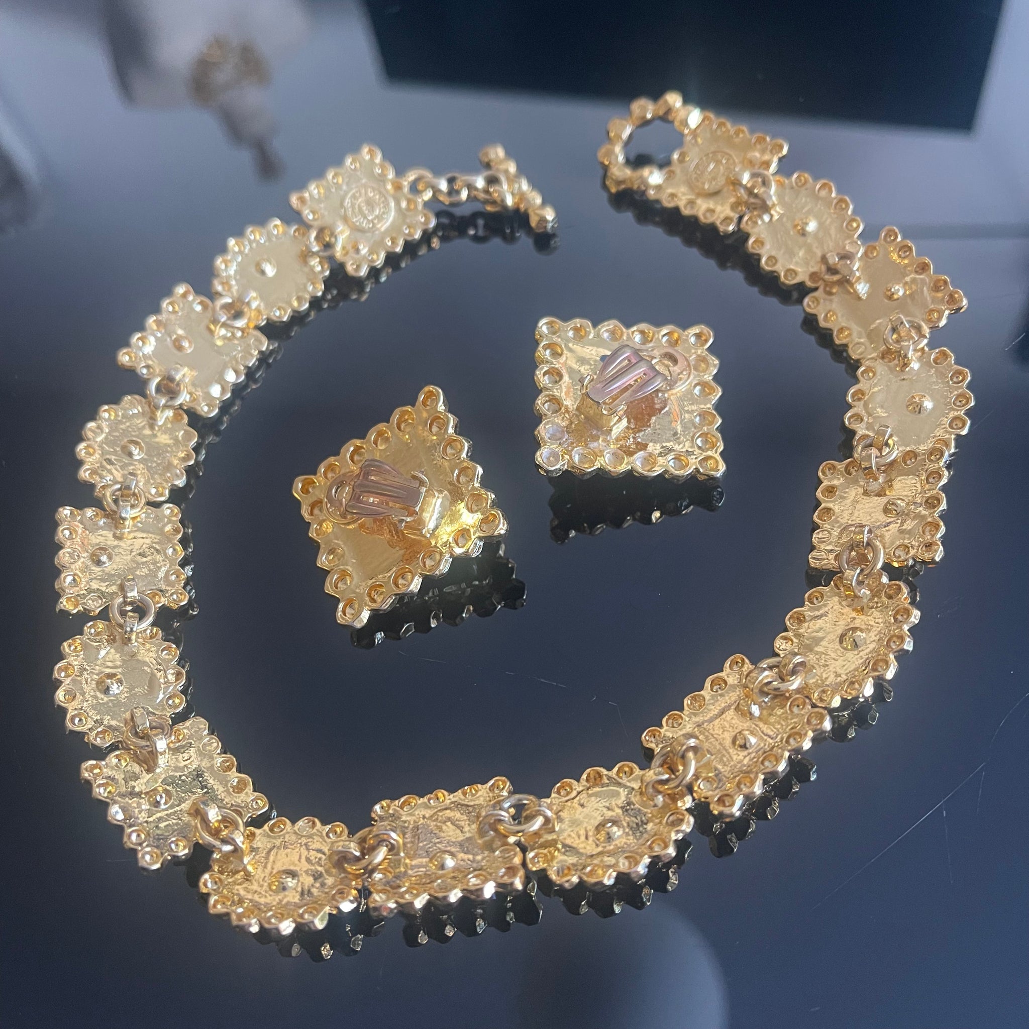 Sublime set vintage couture en métal doré et résine de couleur signé Edouard Rambaud comprenant un collier avec cabochons de résine multicolores et les boucles clips assortis avec cabochons de résine bleue. Parfait état d’usage, voir photos.