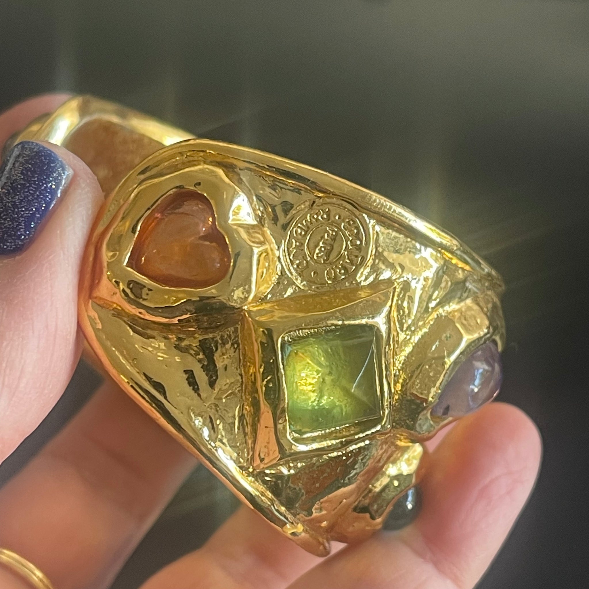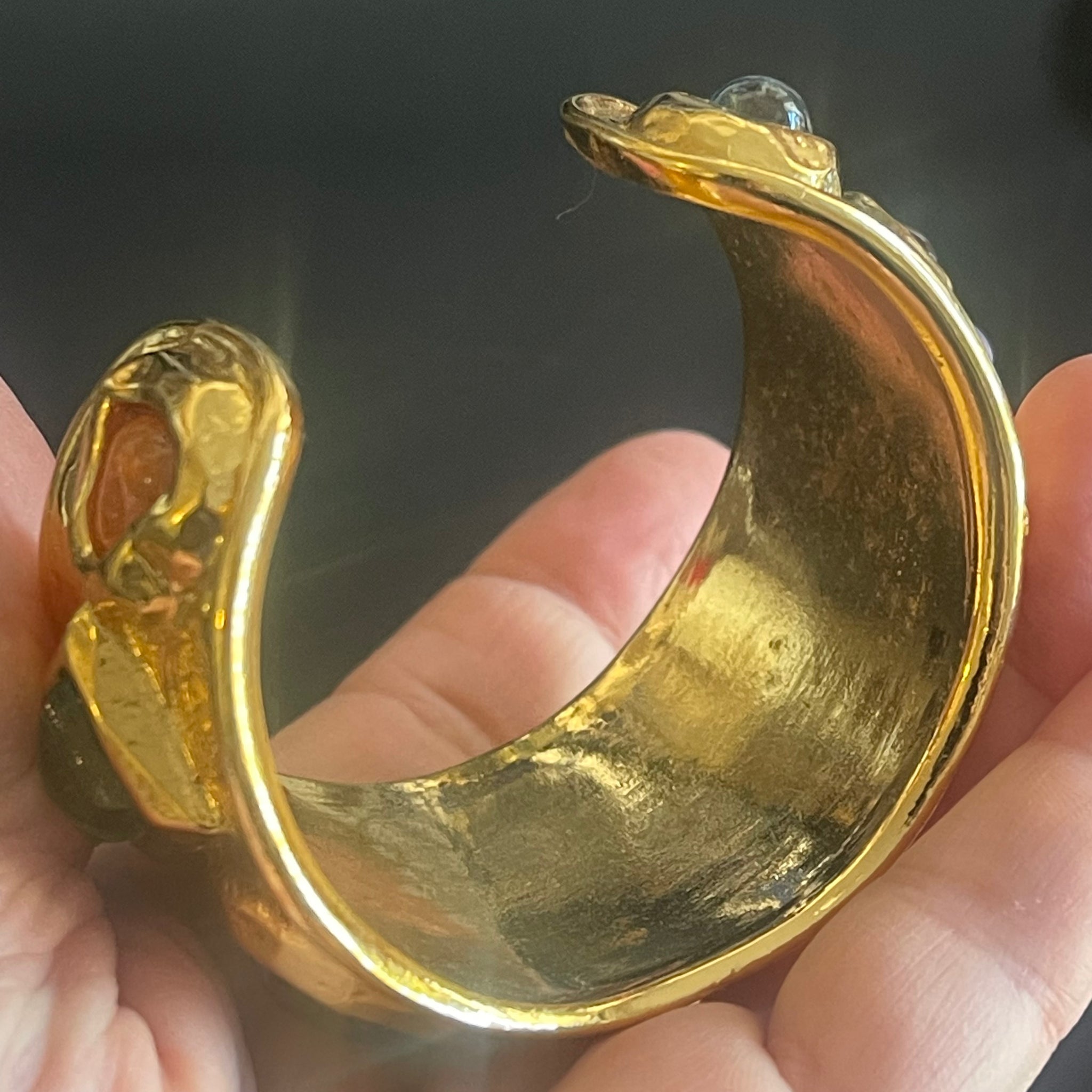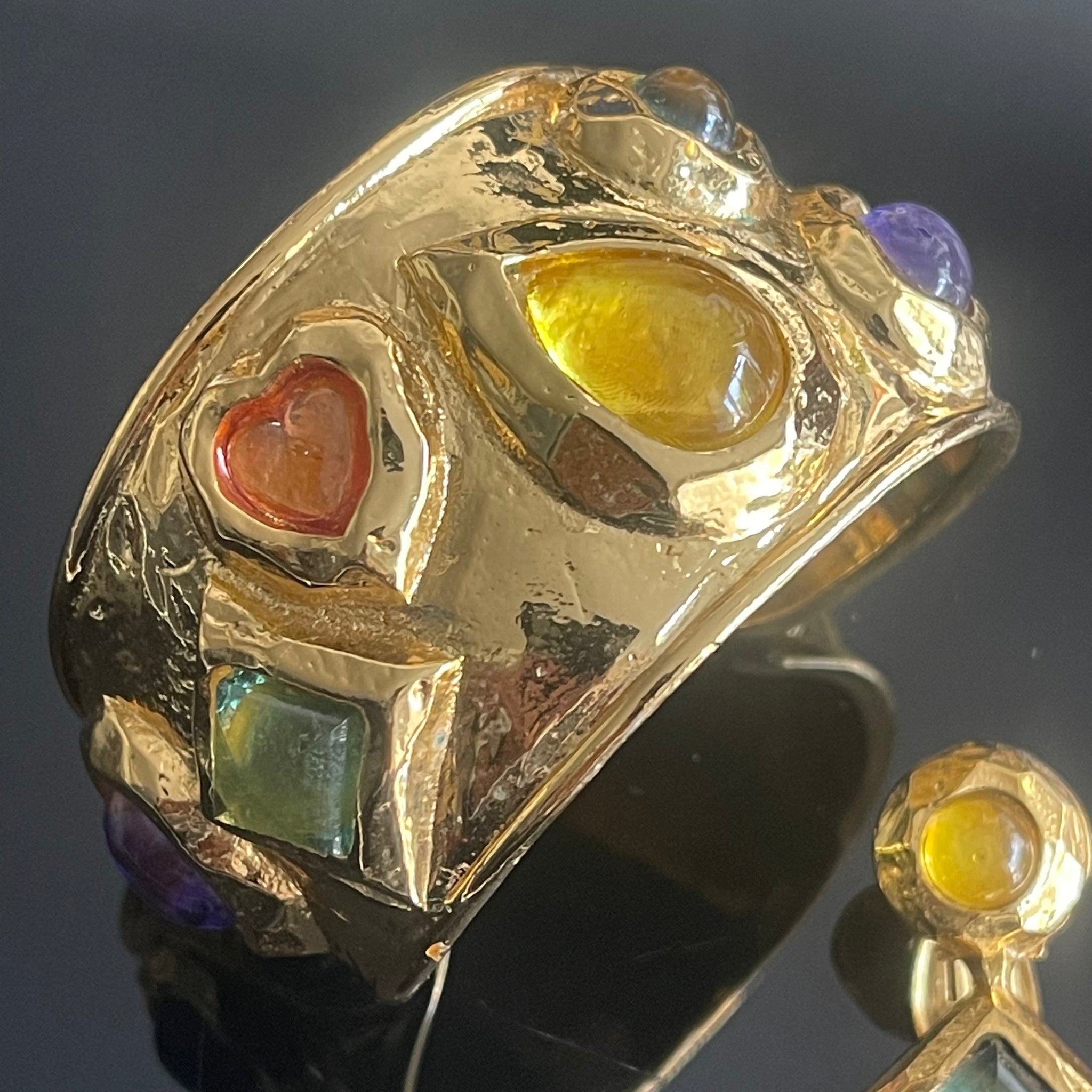 Sublime set vintage couture en métal doré et cabochons de résine colorée signé Edouard Rambaud. Ce set comprend un sublime bracelet manchette et des boucles d’oreilles à clips. Très bel état d’usage, voir photos.