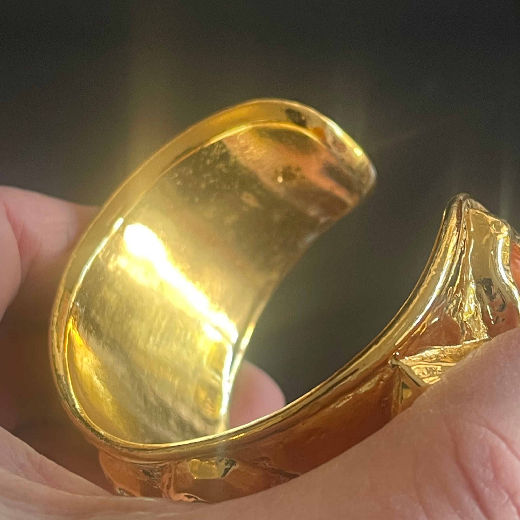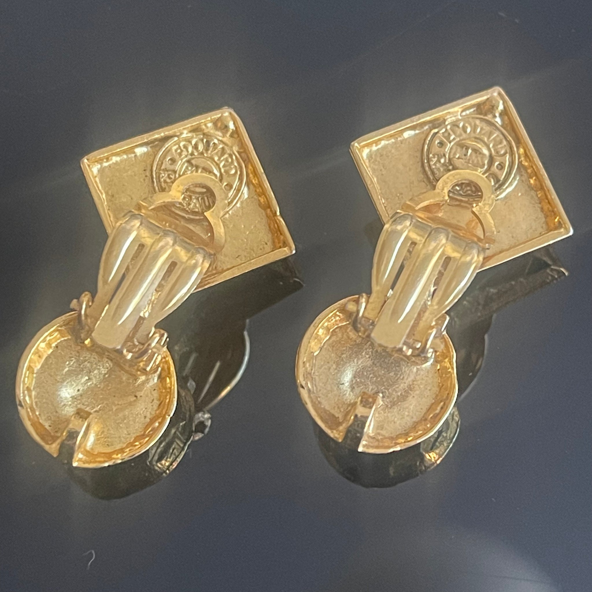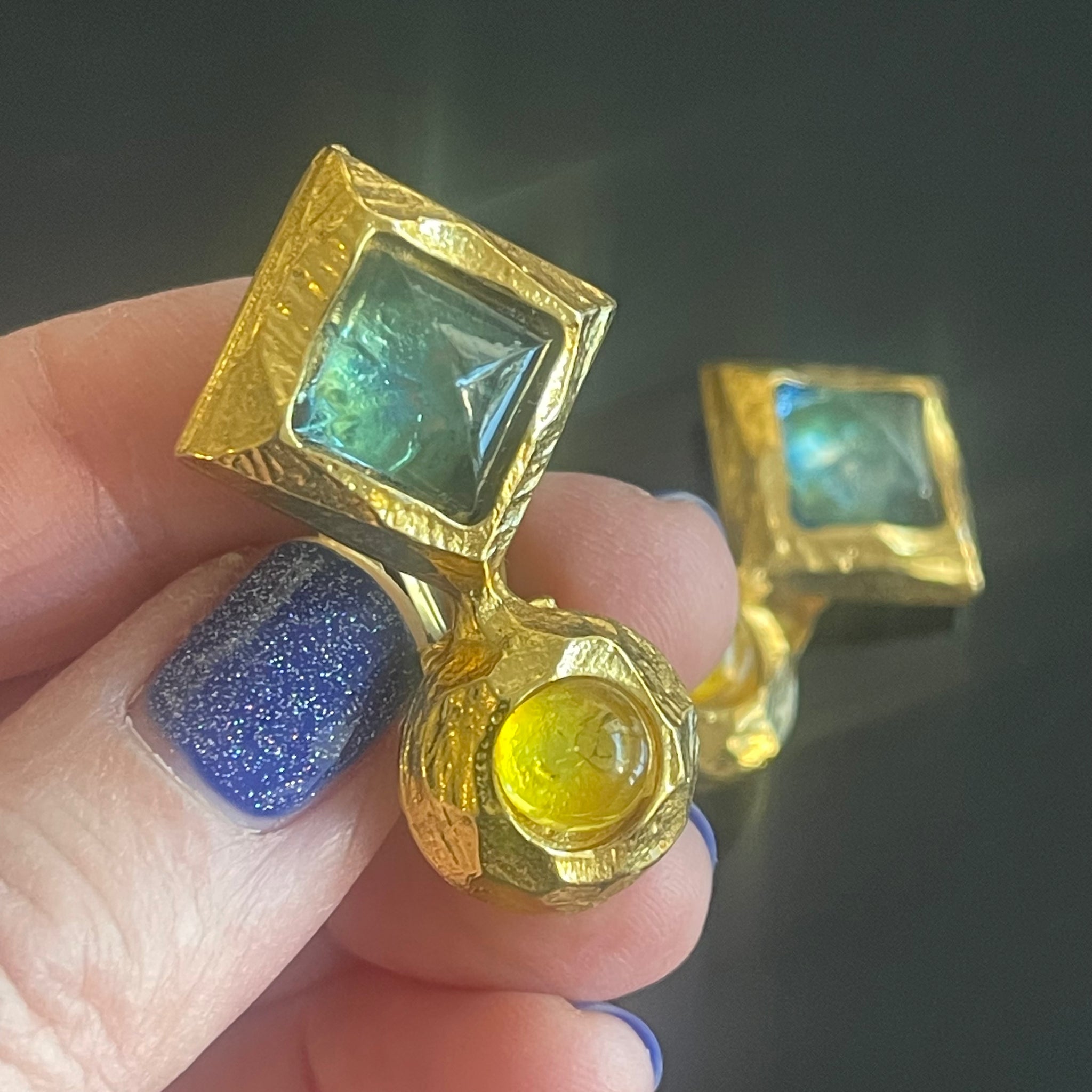 Sublime set vintage couture en métal doré et cabochons de résine colorée signé Edouard Rambaud. Ce set comprend un sublime bracelet manchette et des boucles d’oreilles à clips. Très bel état d’usage, voir photos.