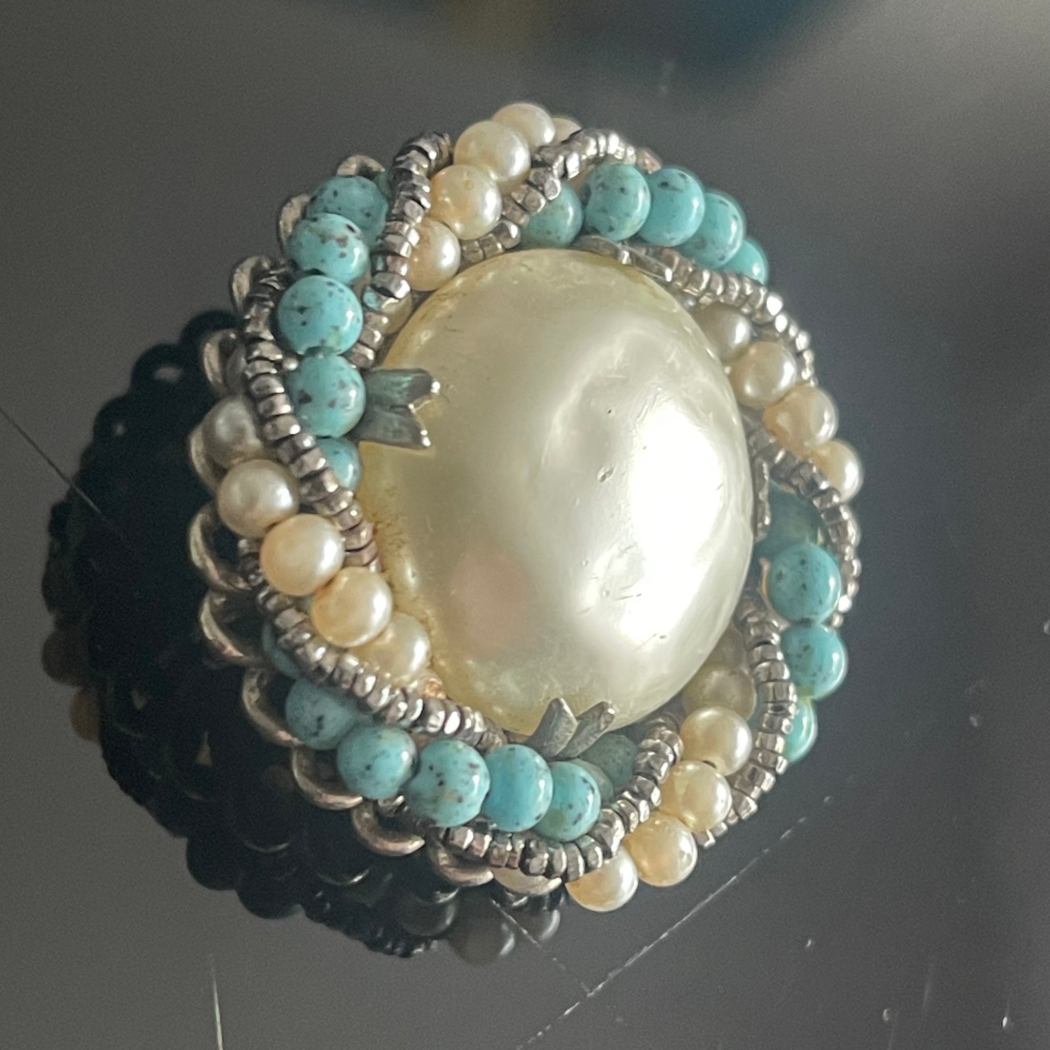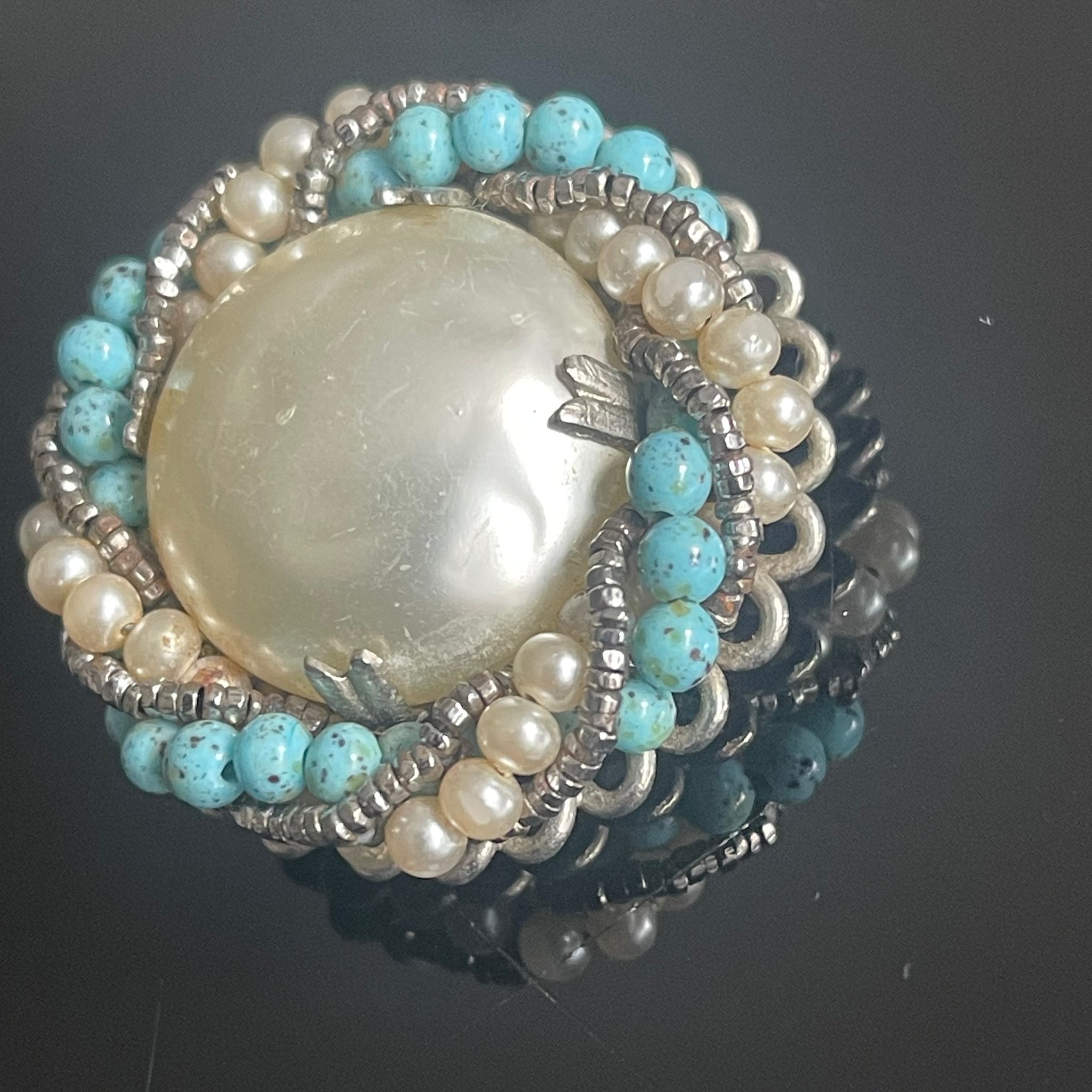 Très jolie broche ancienne, très probablement par Rousselet, en métal argenté avec une grosse perle baroque centrale en cabochon, entourée de guirlandes de petites perles métalliques, perles et perles de verre turquoise mêlées. Très bon état d’usage, légères traces d’usure, voir photos.