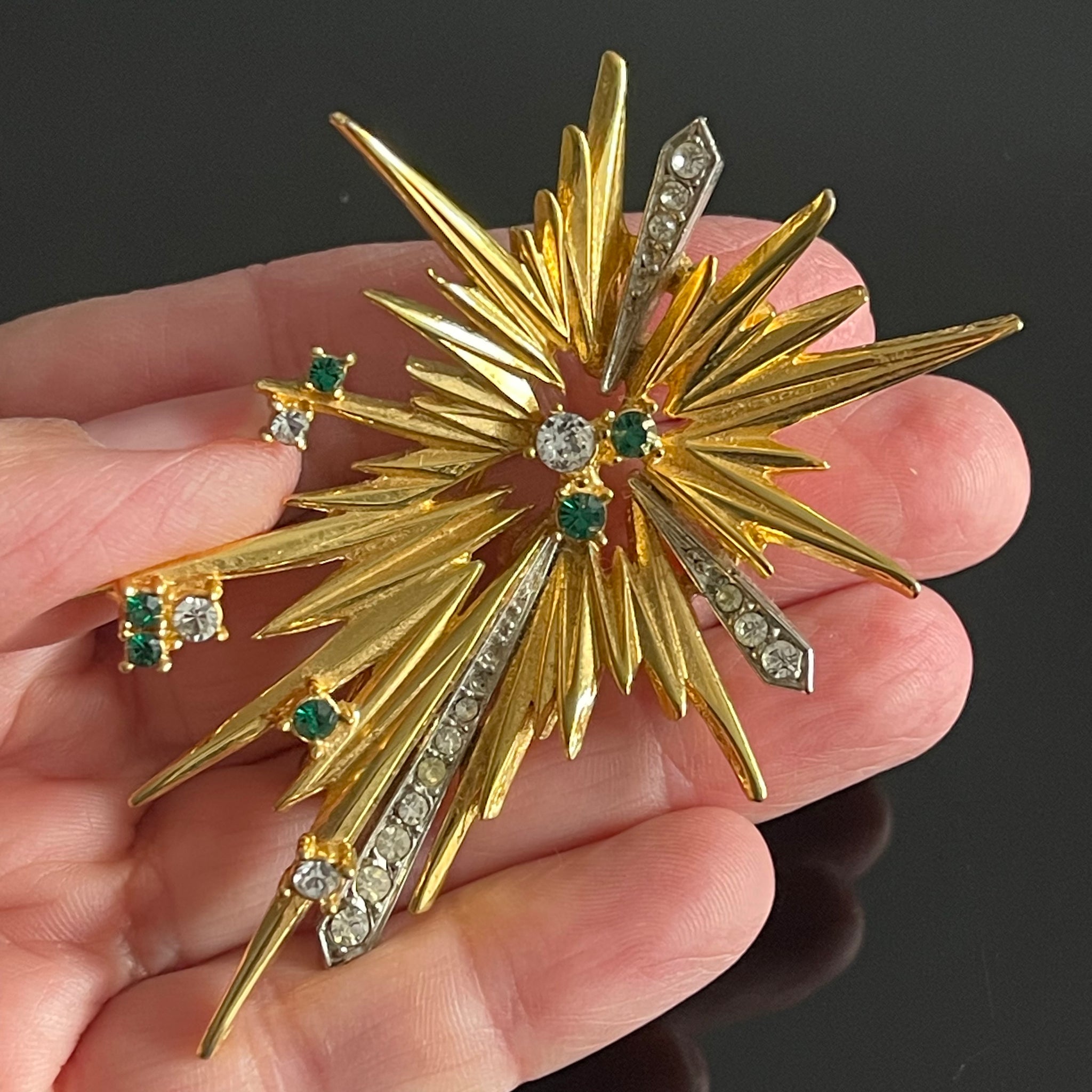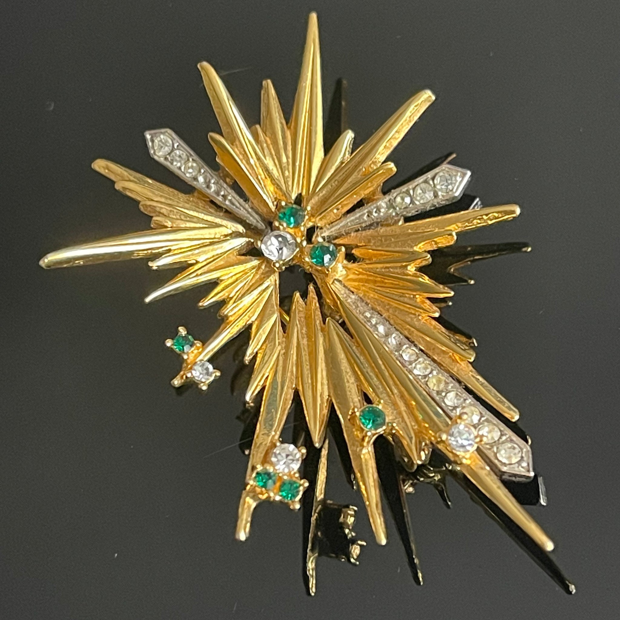 Sublime broche ancienne en métal doré et métal argenté, pierres blanches et pierres vertes (cristal). Fabrication typique des années 50 d’extrêmement belle qualité. Très bon état d’usage, voir photos.Longueur 7,8 cm.