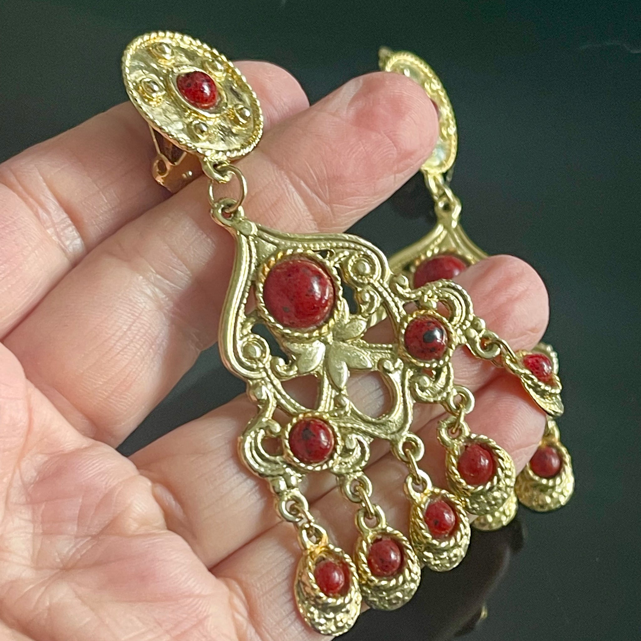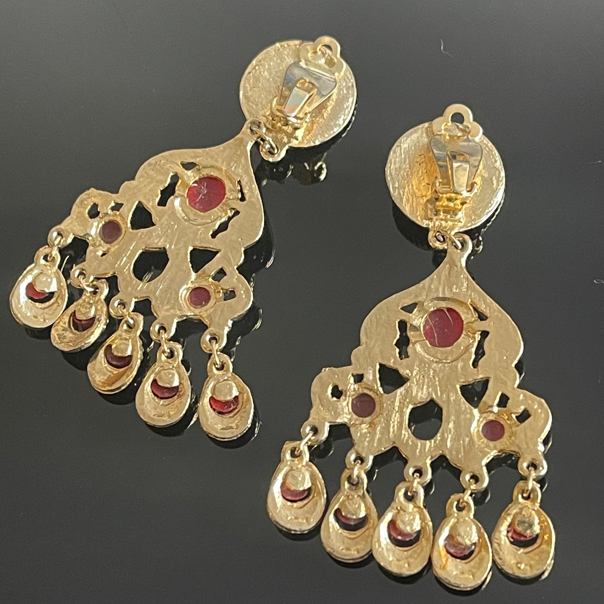 Boucles clips vintage couture pendantes métal doré et cabochons rouges