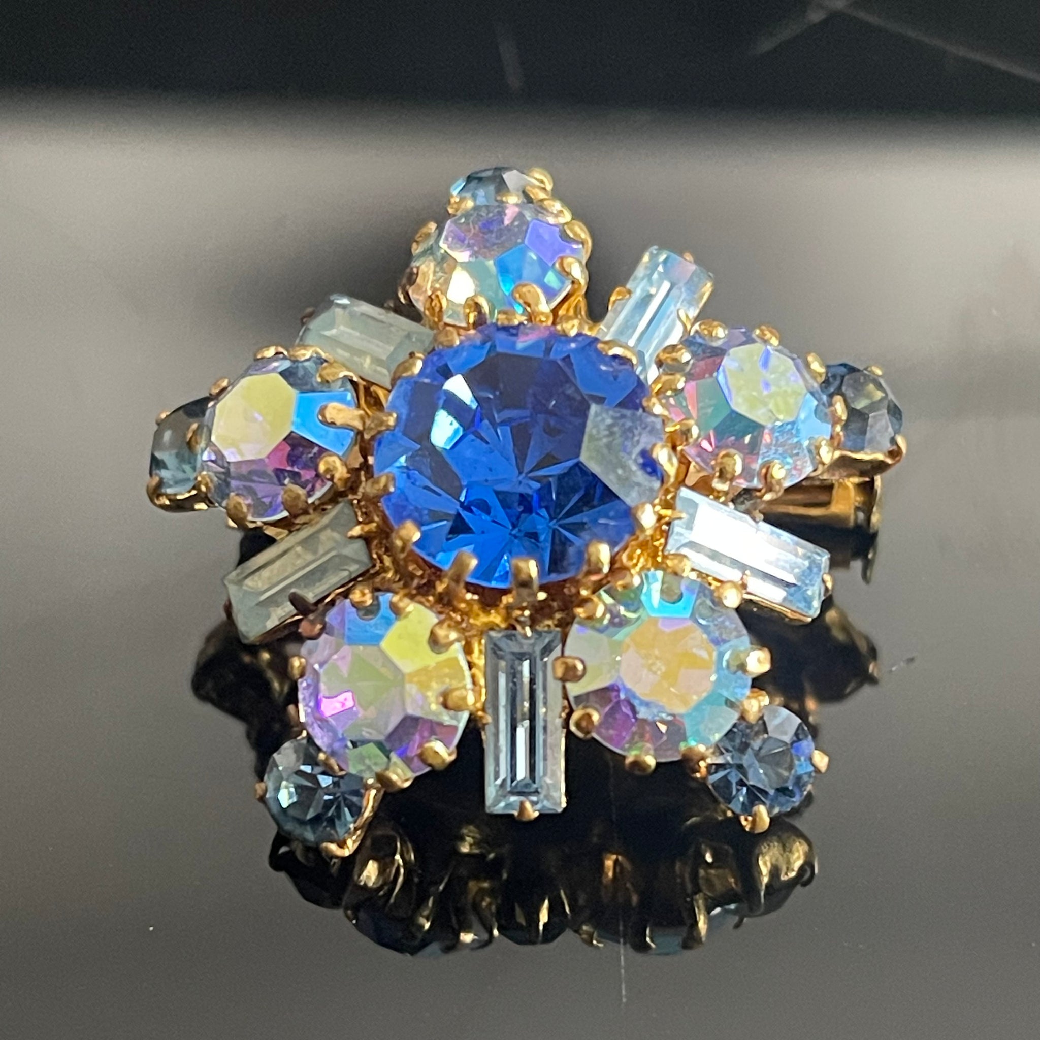 Très jolie broche ancienne, années 50, en métal doré avec pierres bleus en camaïeu et irisées (cristal). Très bon état d’usage, traces au dos, voir photos.Hauteur 3 cm.